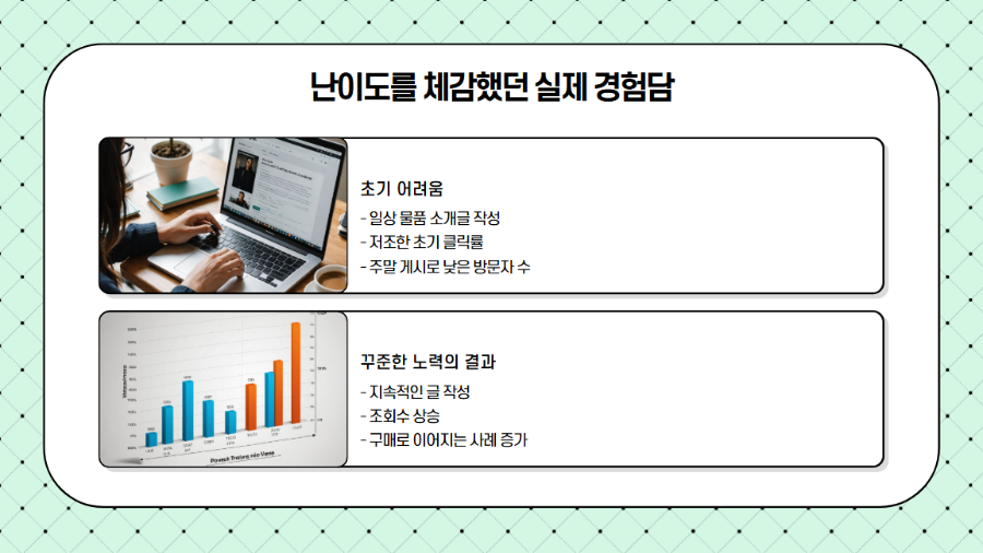 그렇지만 멈추지 않고 꾸준히 글을 작성하자, 점차 조회수가 오르기 시작했고 구매로 이어지는 사례도 나타났습니다. 막상 시작할 때는 수익 창출이 손쉽게 이뤄질 것 같지만, 실제로는 끈기가 필요한 작업이라는 점을 몸소 느꼈습니다.