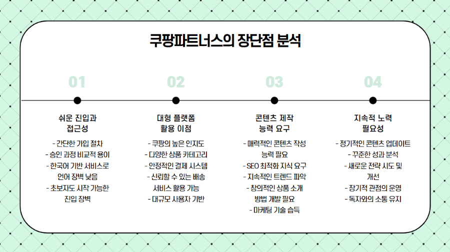 한 번의 시도로 즉각적인 성공을 기대하기보다는, 장기적인 콘텐츠 운영과 검색 알고리즘 이해가 결합되어야 합니다. ‘쿠팡파트너스’는 누구나 시도할 수 있는 문이지만, 결과를 내기 위해서는 부지런함과 참신한 아이디어가 필수적이라는 점을 잊지 말아야겠습니다.