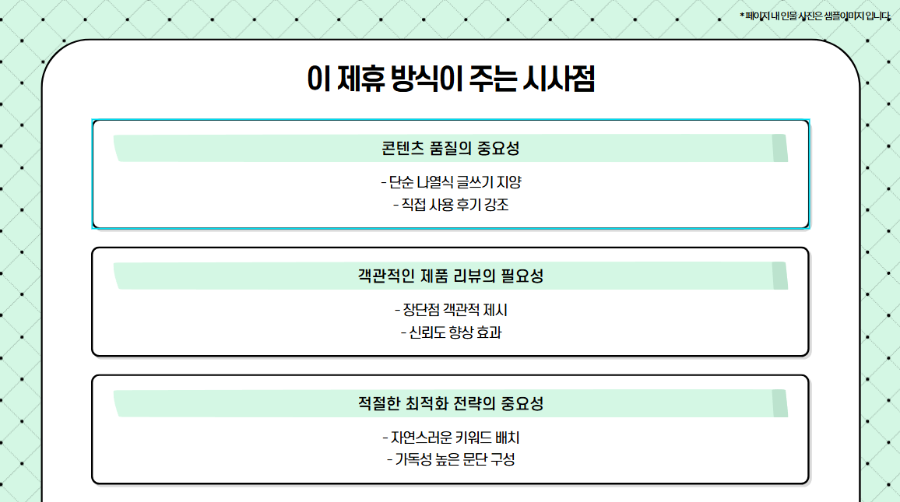 해외 제휴 서비스에 비해 승인 절차가 단순하고, 한국어로 진행되다 보니 진입장벽이 낮습니다. 게다가 한번 링크를 생성해두면 별다른 관리 없이도 계속 노출이 가능하다는 점도 눈여겨볼 부분이죠. - 콘텐츠 신뢰도 확보의 어려움