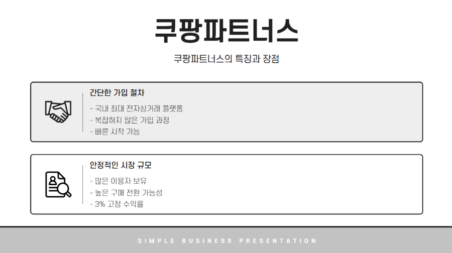 판매가의 3%를 고정적으로 받을 수 있으며, 로켓배송 등 빠른 물류 서비스를 통한 높은 구매 전환율을 기대할 수 있다.