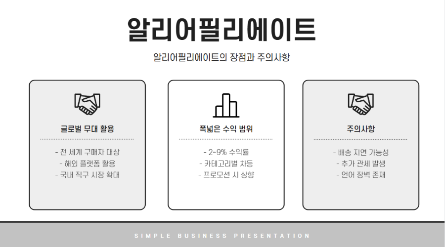 알리어필리에이트는 해외 시장에서 다양한 물건을 선보이고 싶을 때 유용하다. 폭넓은 수익률을 기대할 수도 있지만, 해외 배송 이슈나 언어 장벽이 부담스럽다면 좀 더 준비가 필요한 편이다. 모든 걸 한 번에 시도하기보다, 한쪽에서 경험과 노하우를 쌓아간 뒤에 점차 확장하는 접근을 추천한다.