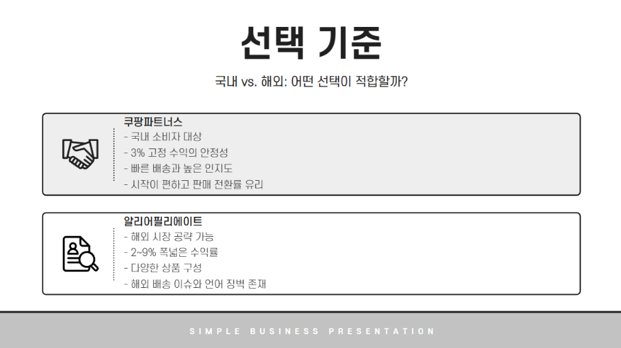 - 알리어필리에이트: 전 세계 구매자를 아우름, 다양한 해외 상품과 직구 문화 결합 가능.