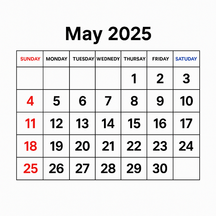 2025년 5월 1일(목)부터 5월 31일(토)까지입니다.