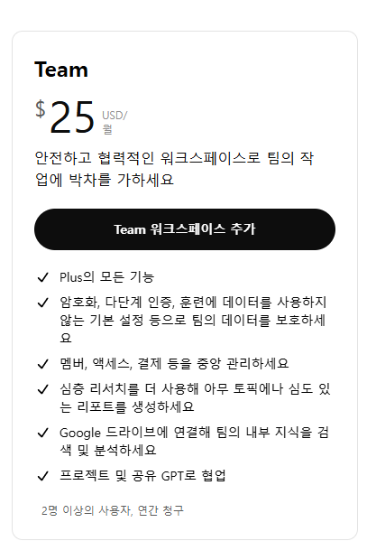| Team | 사용자당 25달러/월 | GPT-4o, 공유 작업공간 | 협업 기능, 관리 도구 제공 |