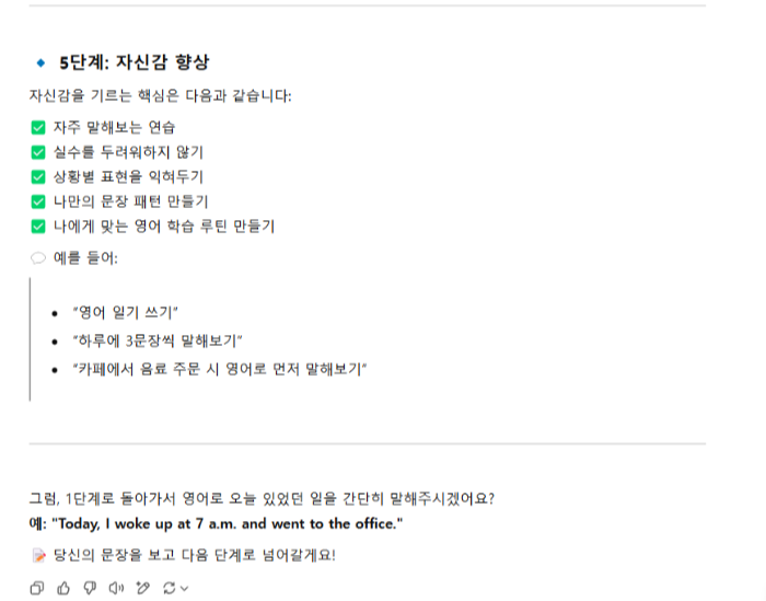 5단계: 자신감 향상 학생이 영어 말하기에 대한 두려움을 줄이고 일상 속에서 영어를 활용할 수 있도록 격려와 팁을 제공합니다.