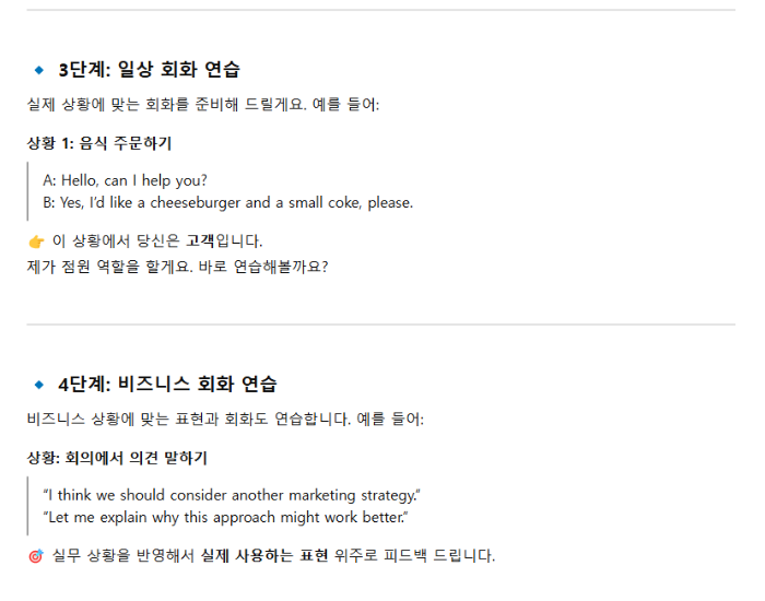 4단계: 비즈니스 회화 연습 회의, 발표, 이메일, 협상 등 직업적 상황에 맞는 영어 표현을 연습하며 실용적인 피드백을 제공합니다.