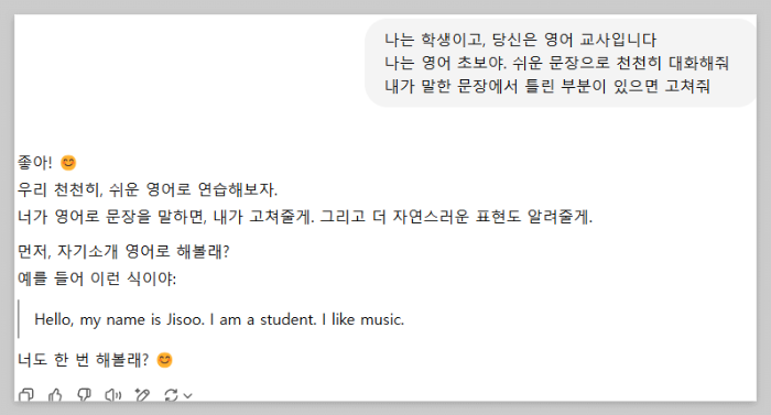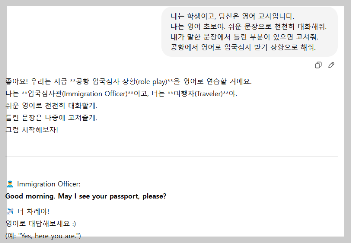 단순히 "영어로 대화하자"는 말보다, 구체적으로 "당신은 친절한 영어 튜터입니다" 또는 "나는 학생이고, 당신은 영어 교사입니다"라고 지정해주는 것이 좋아요. 이렇게 하면 챗GPT가 더 일관성 있게 영어 선생님 역할을 수행해줍니다.